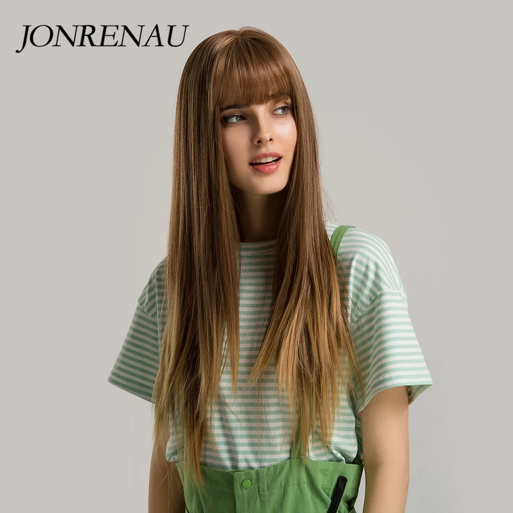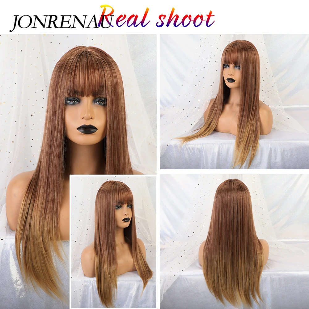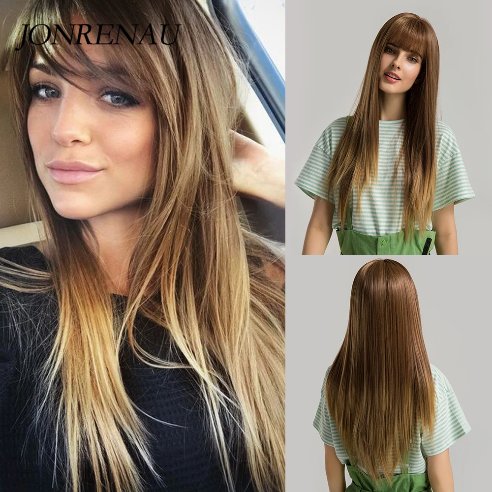 JONRENAU Women Fashion Synthetic Long Straight Brown Mixed Blonde Hair Wigs with Bangs for Black/Wh