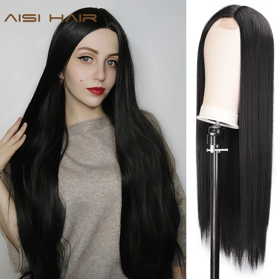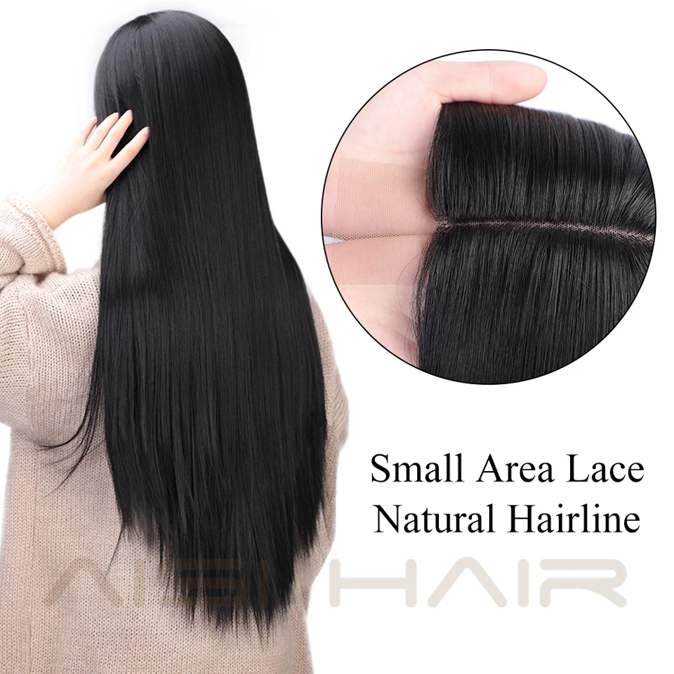 AISI HAIR Long Straight Black Wig Synthetic Wigs for Women Natural Middle Part Lace Wig Heat Resist