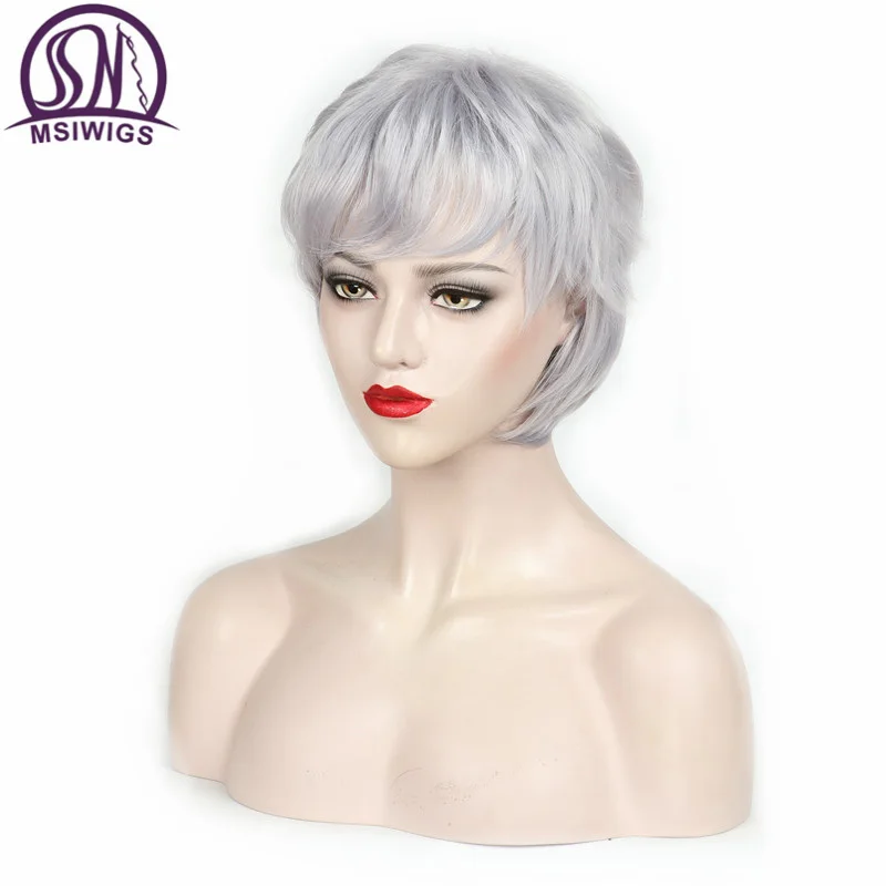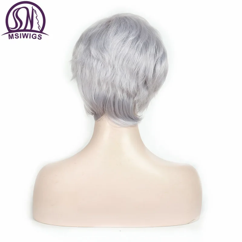 BEST QUALITY MSIWIGS Straight Short Wig for Elder Women Silver White Grey Synthetic Wigs with Bangs Natural Brow
