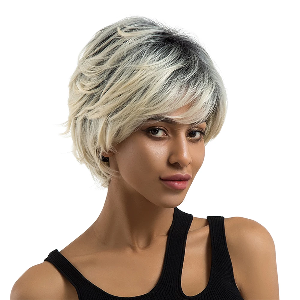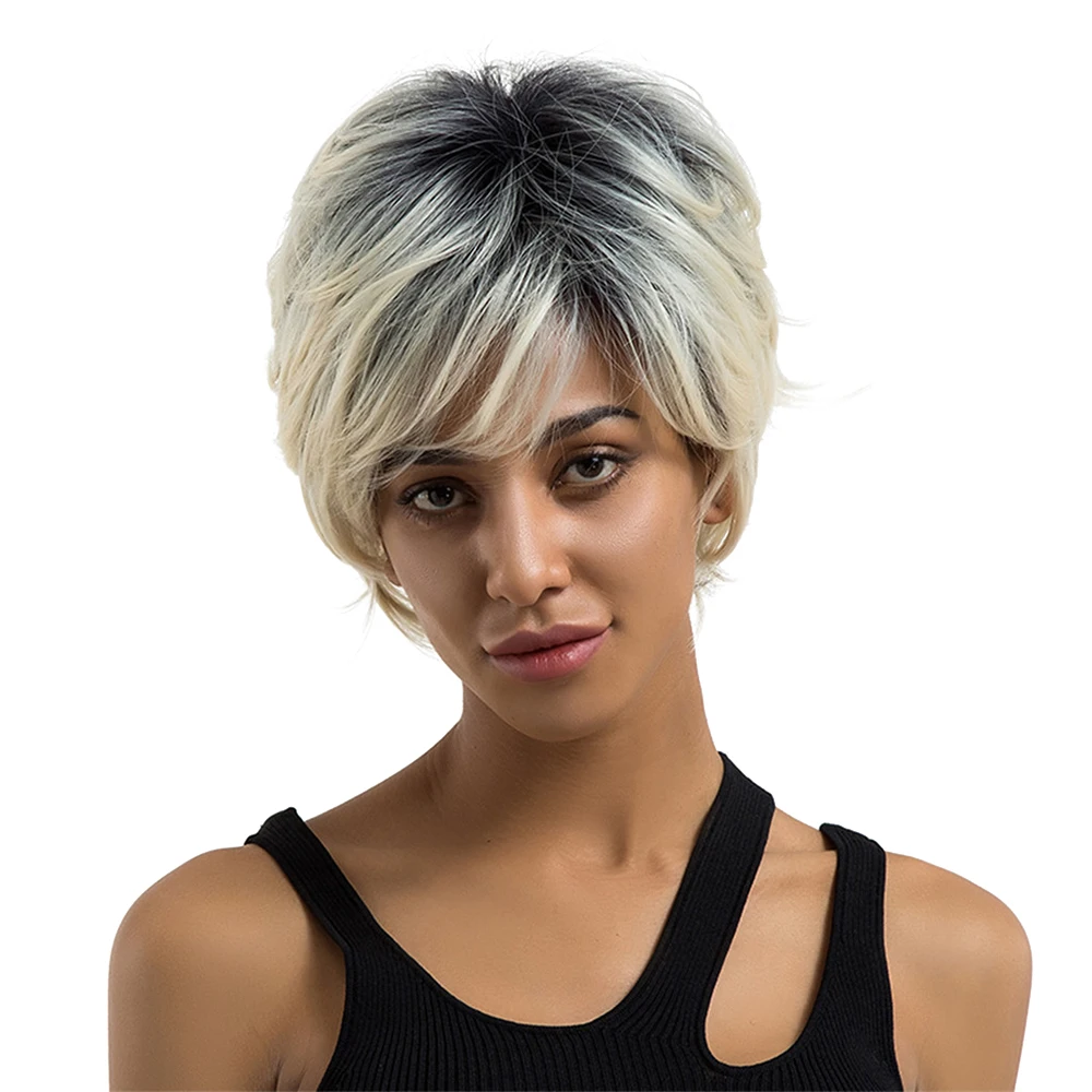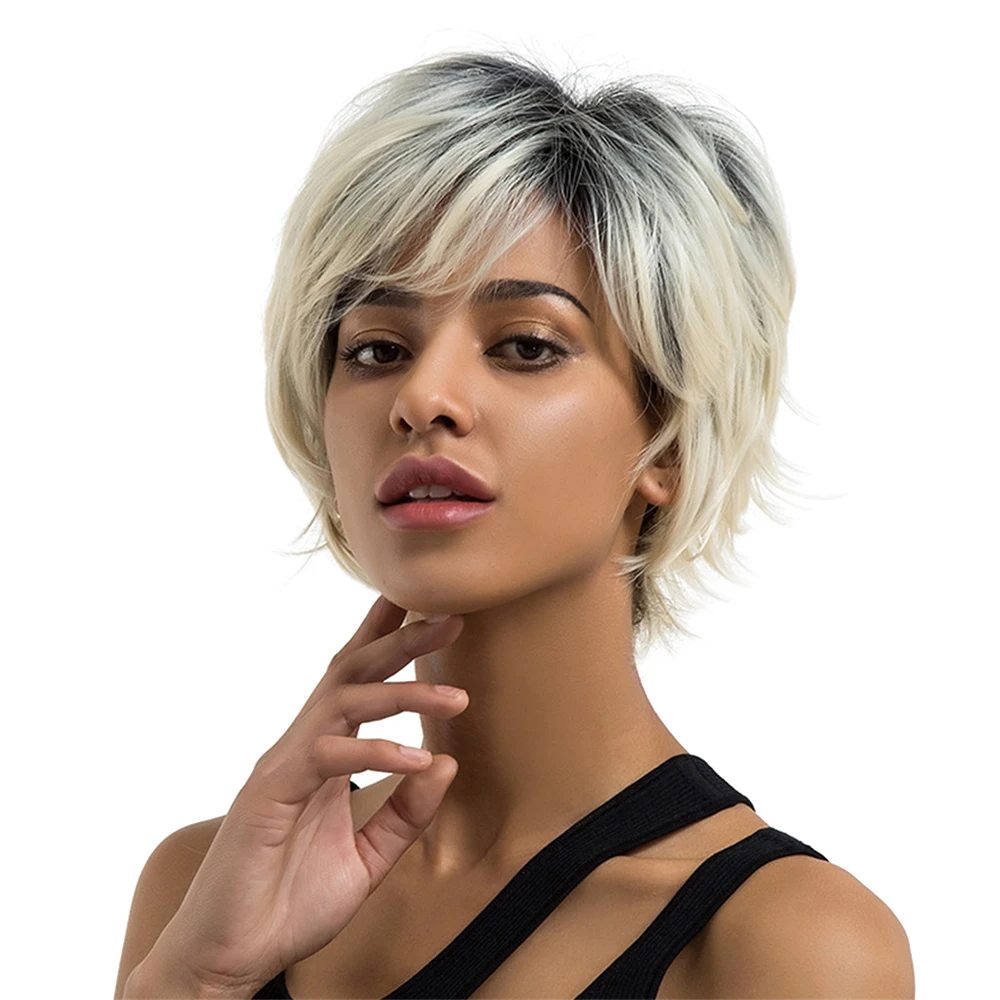 ORIGINAL ELEMENT 8" Synthetic Hair Wig Ombre Short Straight Highlights 2 Tone Layered Dark Root Hairpiece wi