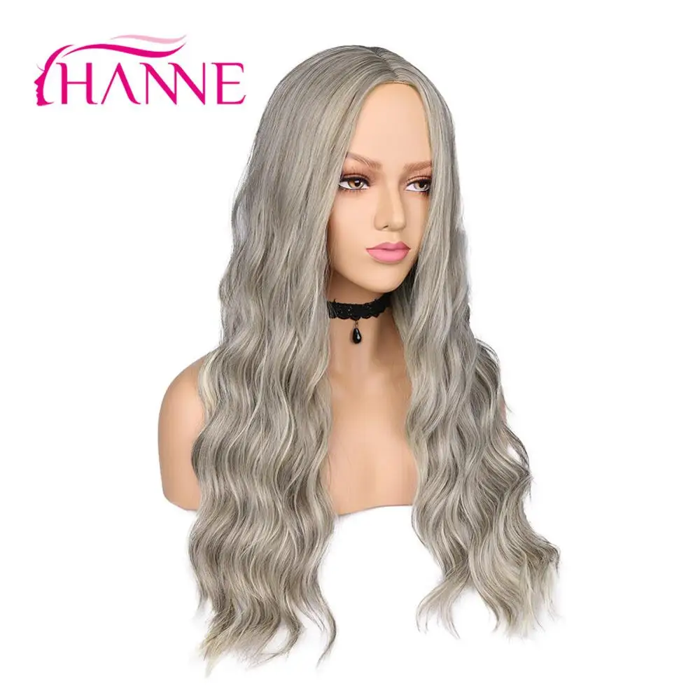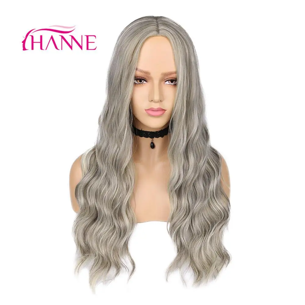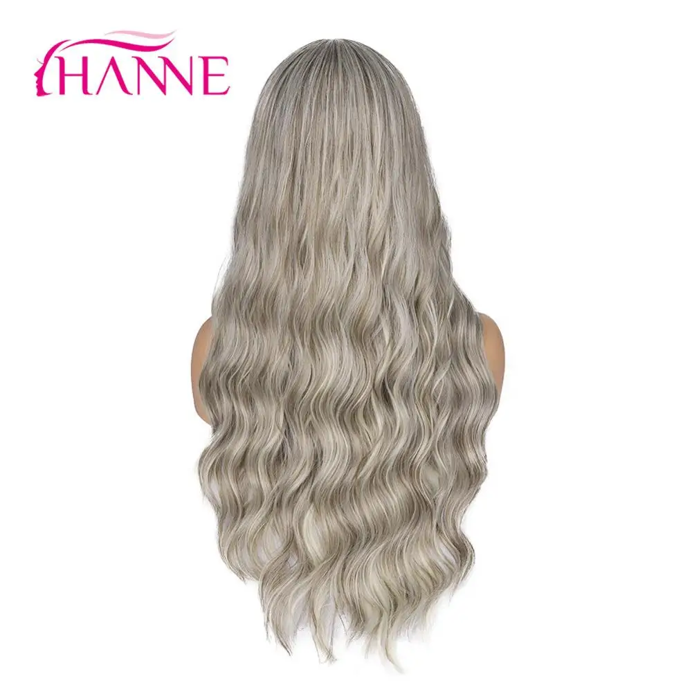 HIGH QUALITY HANNE Long Wavy Ombre Grey Brown Beige Highlights Synthetic Natural Wig Heat Resistant Wig For Blac